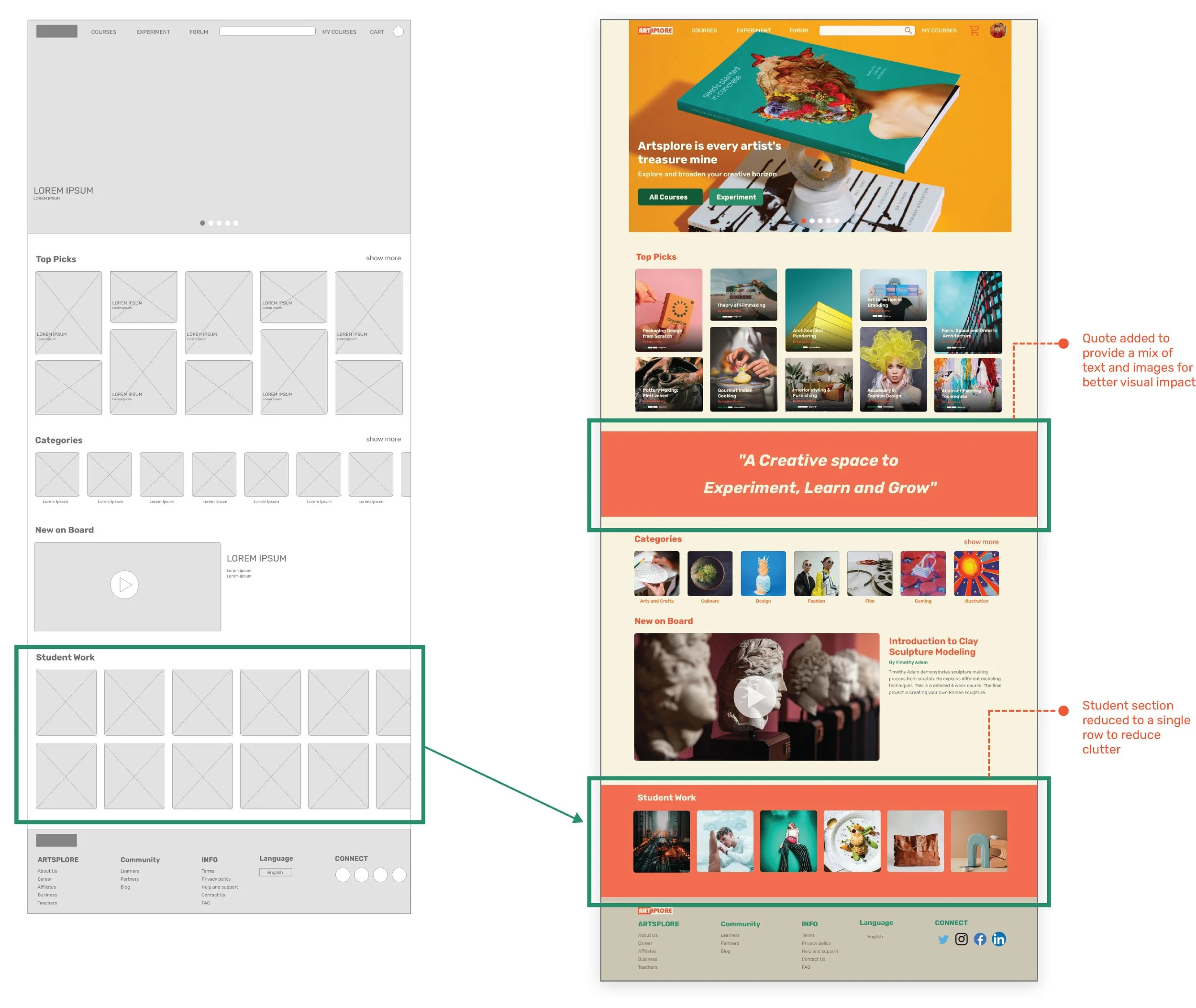 Based on insights from the usability study, I made changes to Homepage layout. One of the changes I made was removing an entire row of student’s work and increasing spacing between each section. I also inserted a quote which reflects Artsplore’s motive to grab user’s attention.