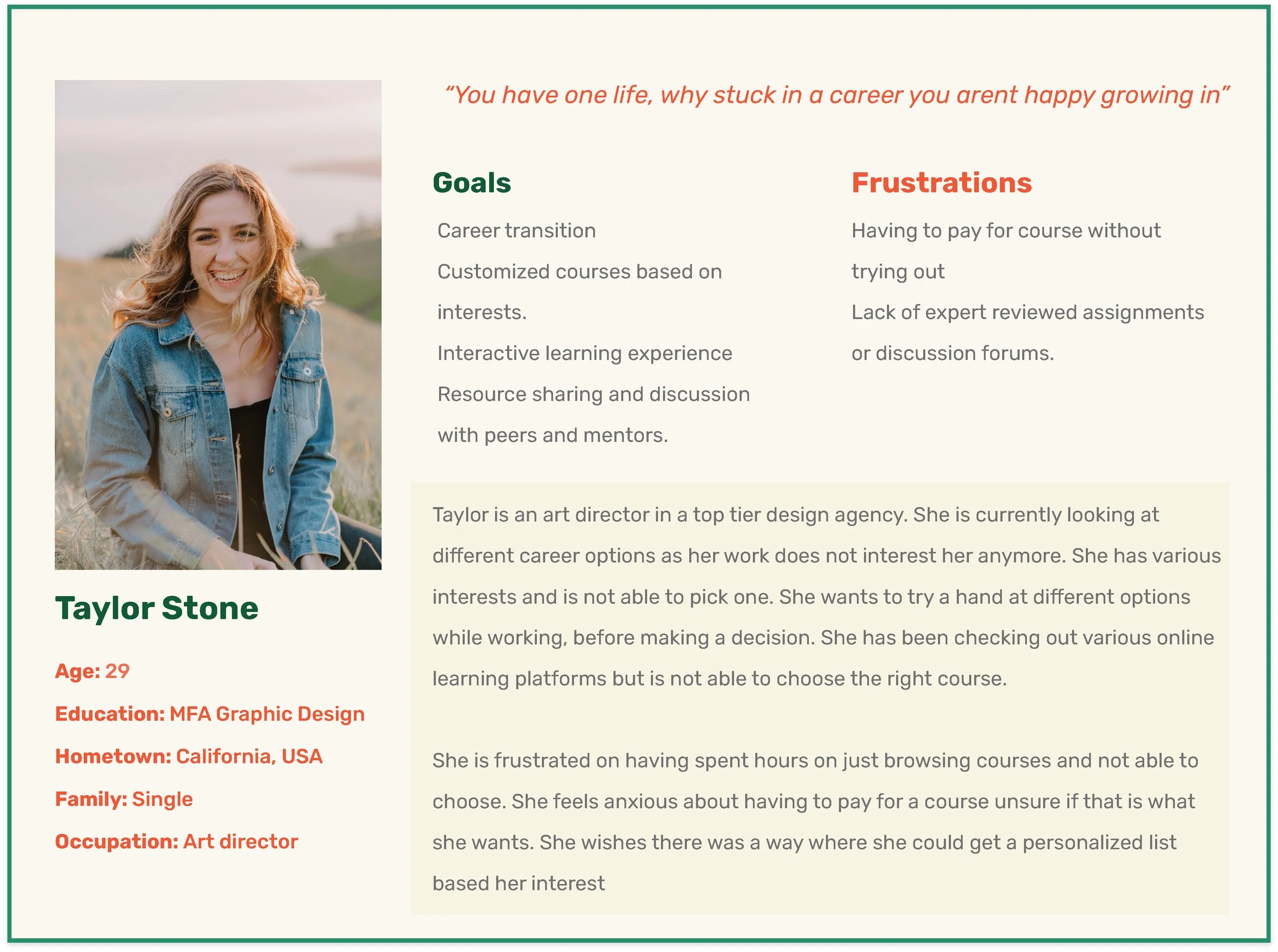 Taylor is a Junior art director working in a design agency who needs personalized course options to choose from in an E- learning platform because she wants to try options before deciding on which path to take for career transition.