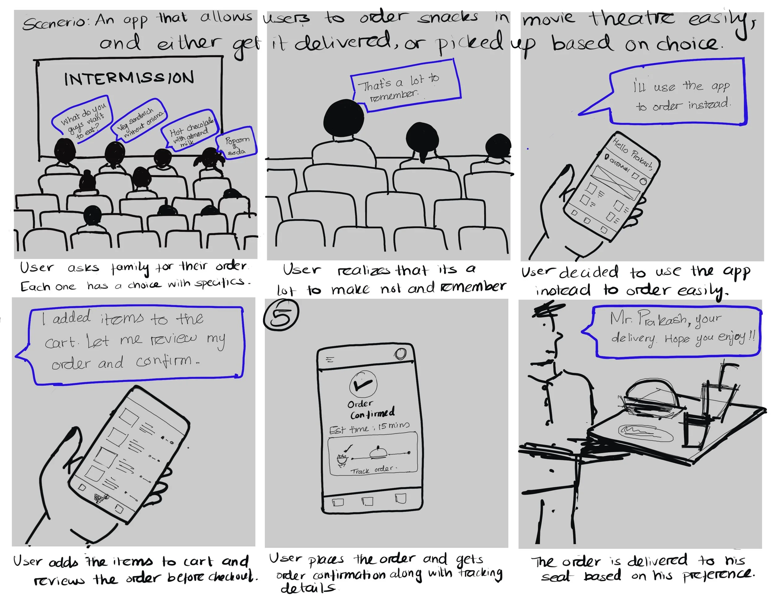 Prakash is a businessman who needs easier, stress free way to order food during movie because he wants to watch the entire movie with his family without having to compromise on food.